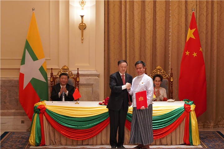 2020年1月18日上午,中国国家主席习近平在访缅期间与缅甸国务资政昂山素季共同见证…